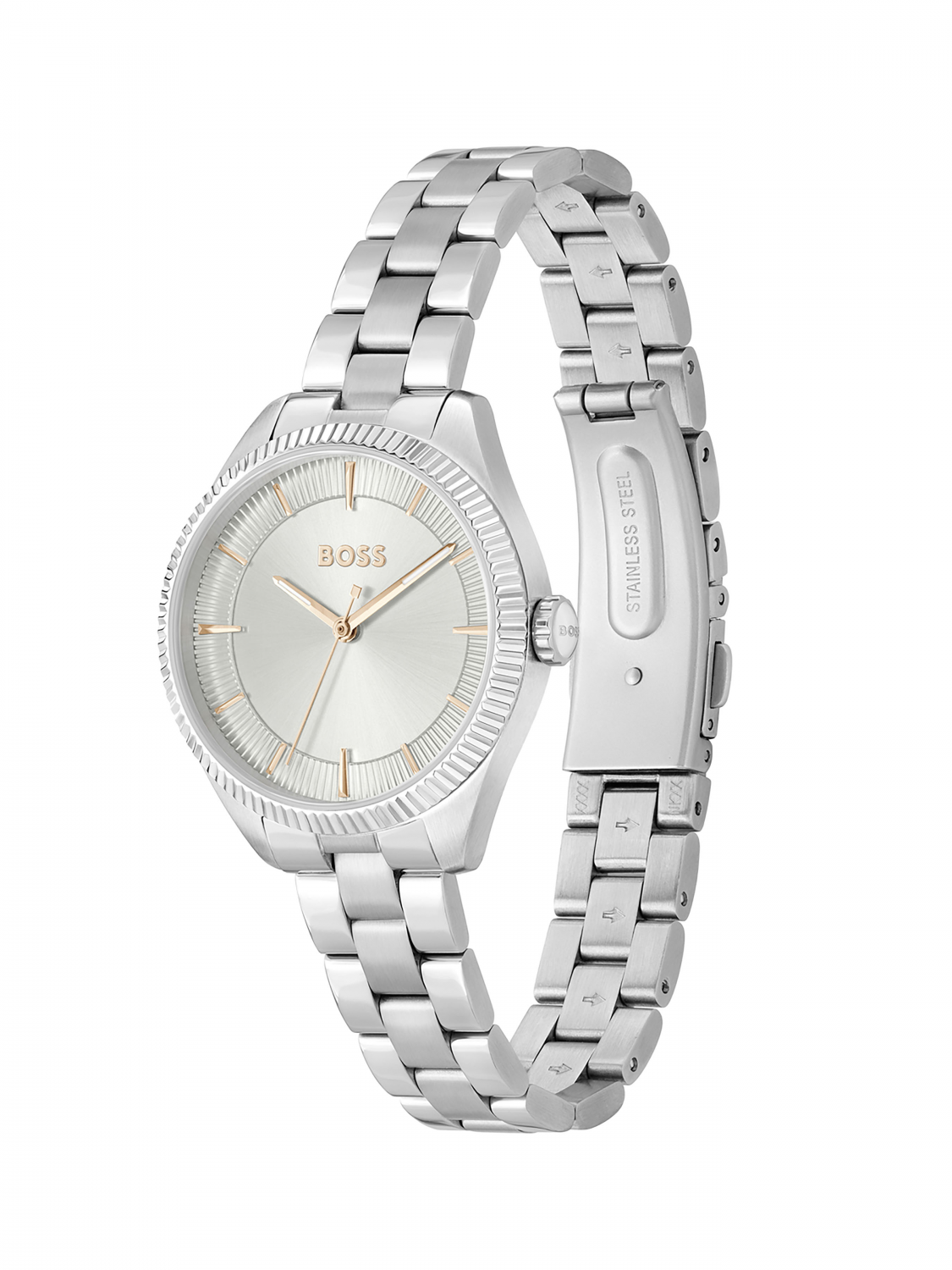 Серебристый циферблат защищен минеральным стеклом. Корпус часов выполнен из нержавеющей стали.