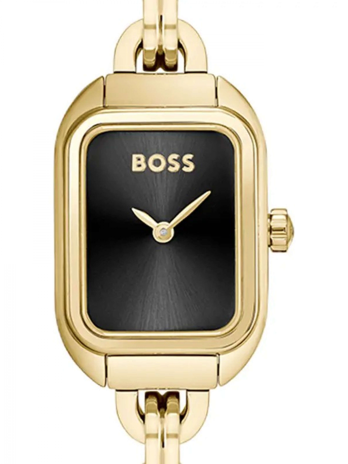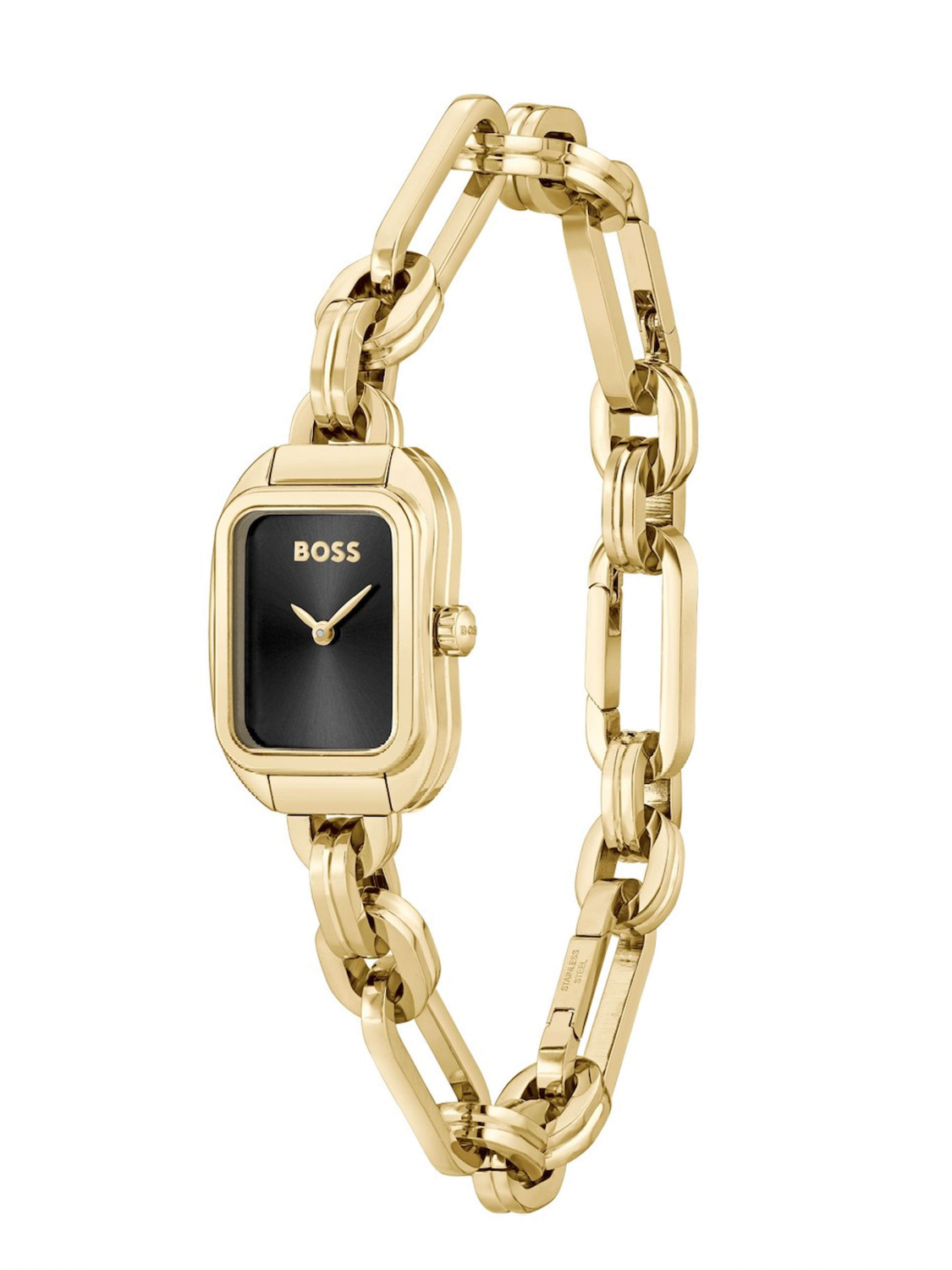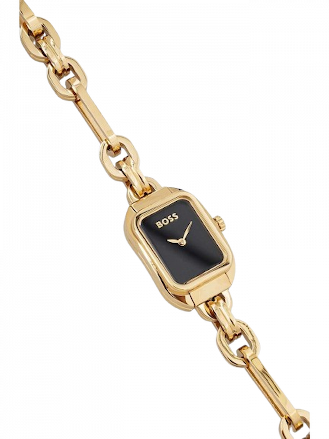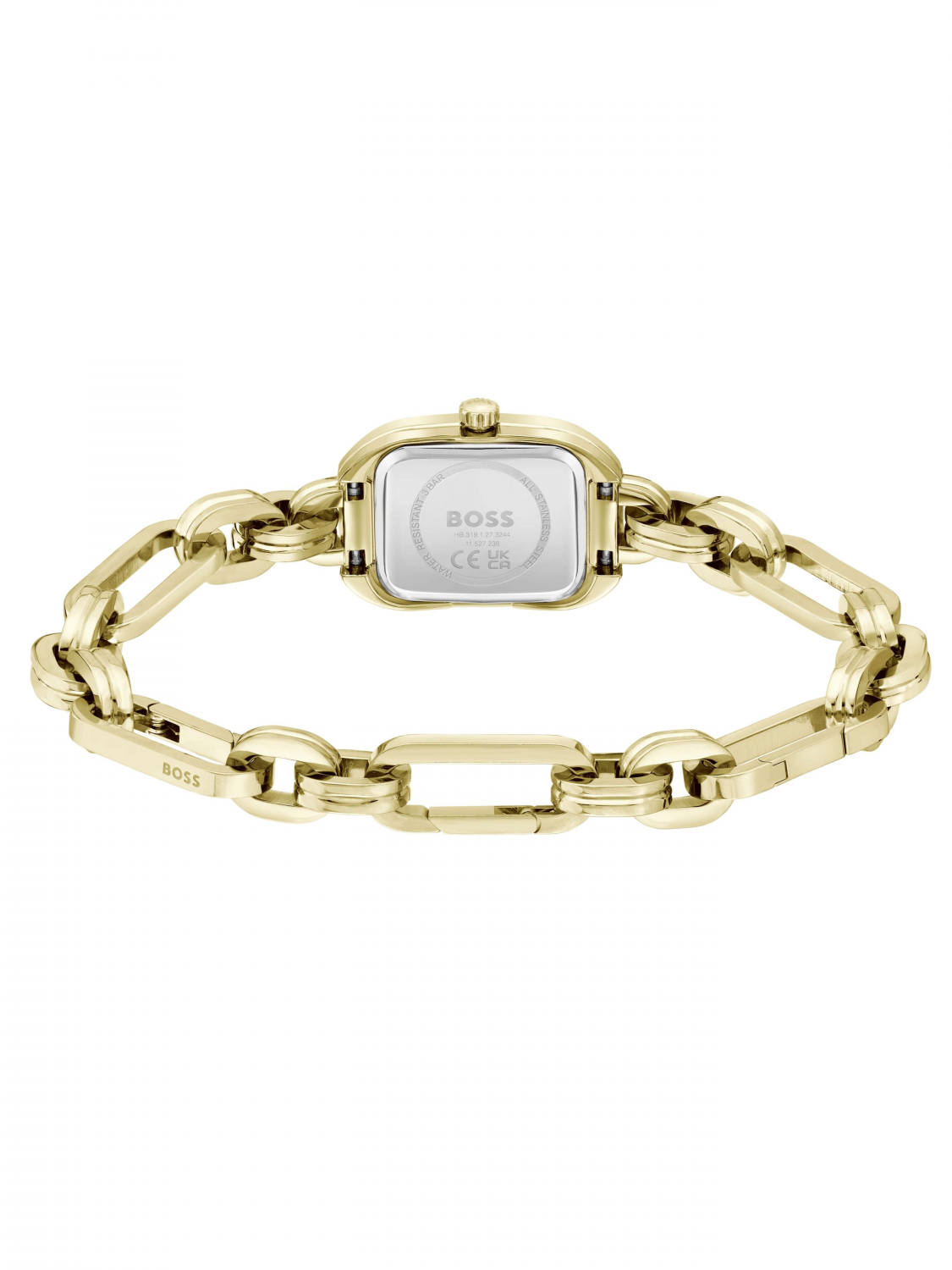 Прямоугольный корпус часов и браслет выполнены из нержавеющей стали 316L с покрытием PVD золотого цвета.