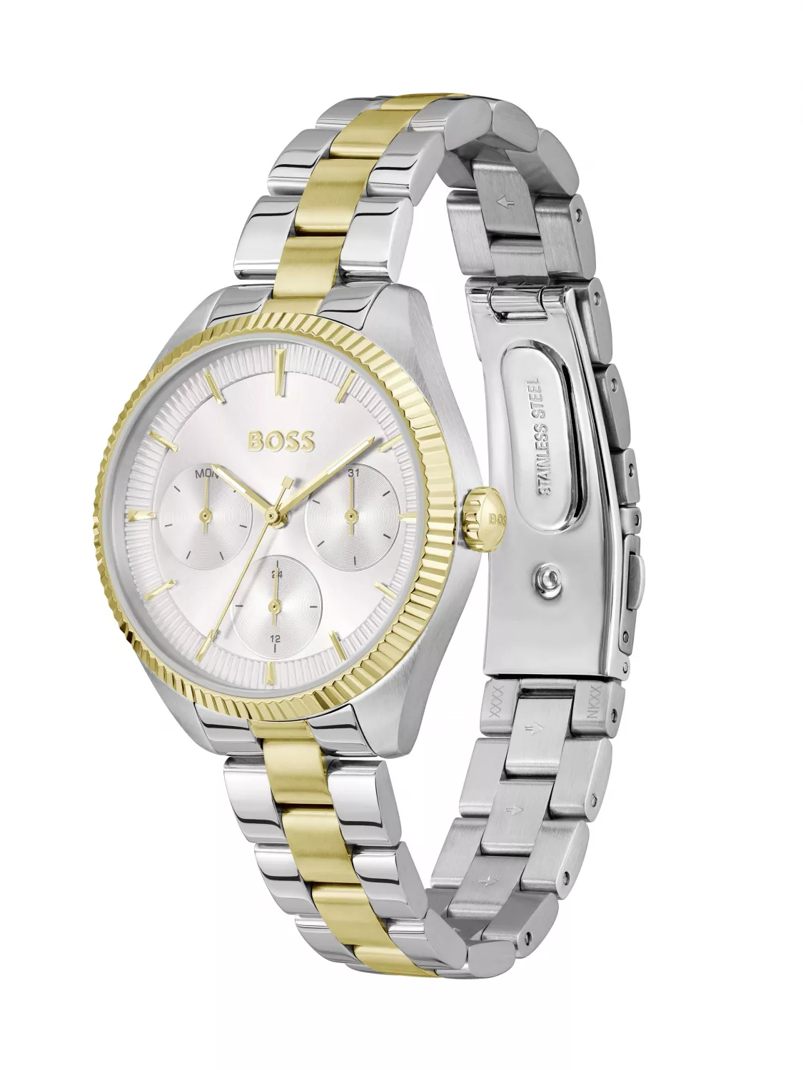 Женские многофункциональные часы BOSS из серии Sage Sport. Корпус из нержавеющей стали диаметром 34 мм.. Браслет из нержавеющей стали. Водонепроницаемость до 5 АТМ,защита от брызг и капель дождя.