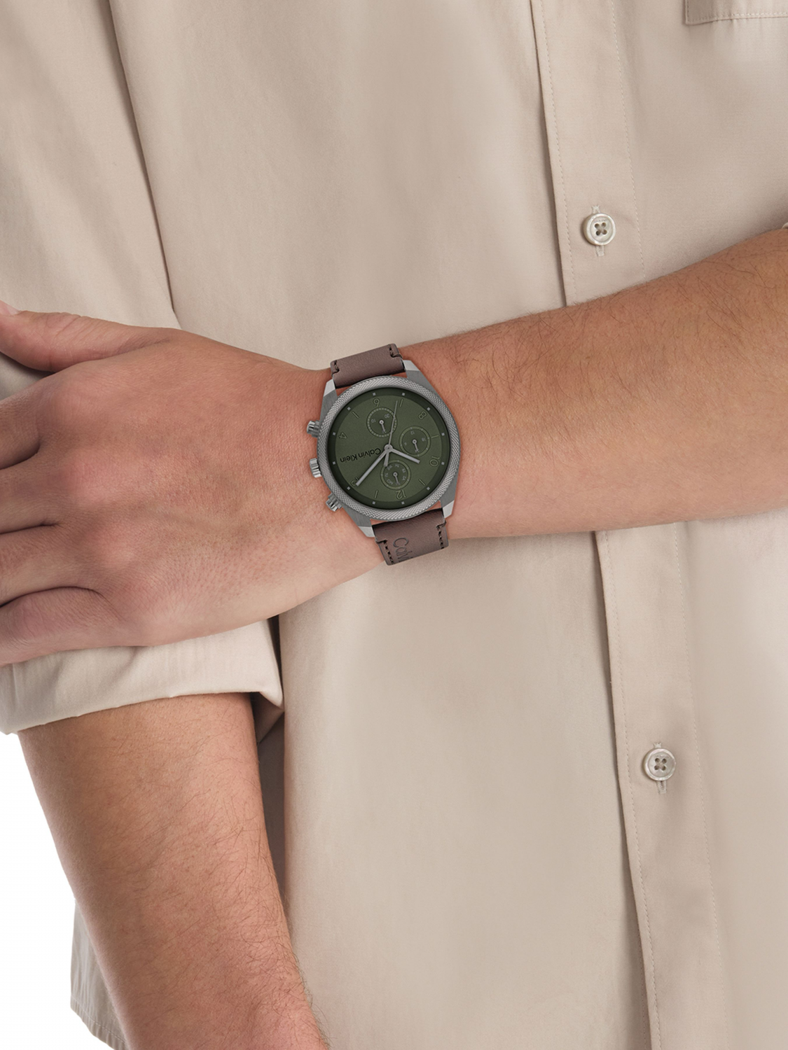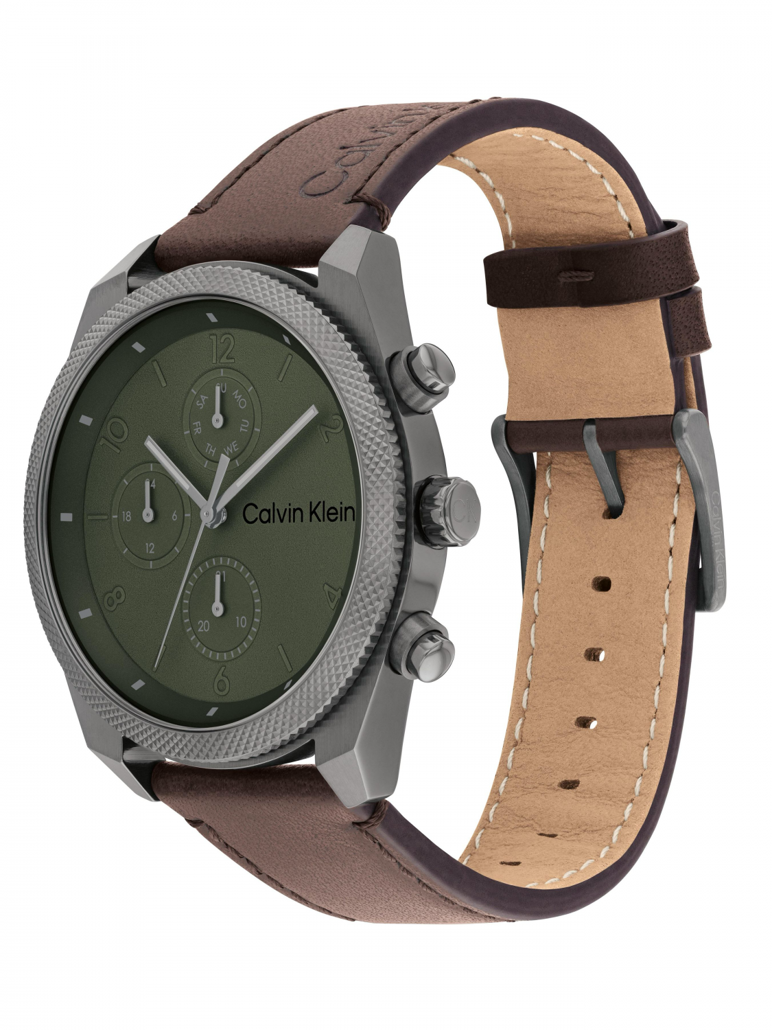 Calvin Klein 25200363 — это стильные мужские многофункциональные часы с кварцевым механизмом из коллекции Impact. Модель отличается современным индустриальным дизайном с текстурированным безелем и контрастным зеленым циферблатом. Он отображает дату, день недели и 24-часовой формат времени на дополнительных субциферблатах. Диаметр циферблата составляет 44 мм.. Корпус выполнен из нержавеющей стали с серым ионным напылением.  Ремешок темно-коричневого цвета из натуральной кожи с классической застежкой-пряжкой.