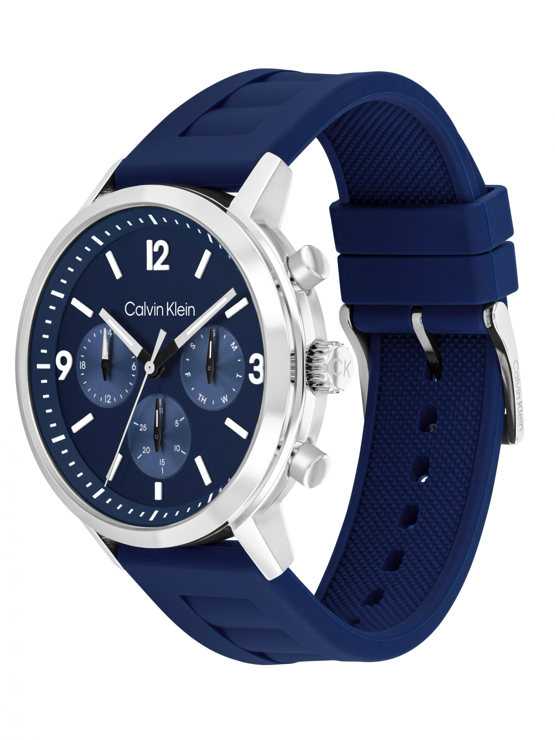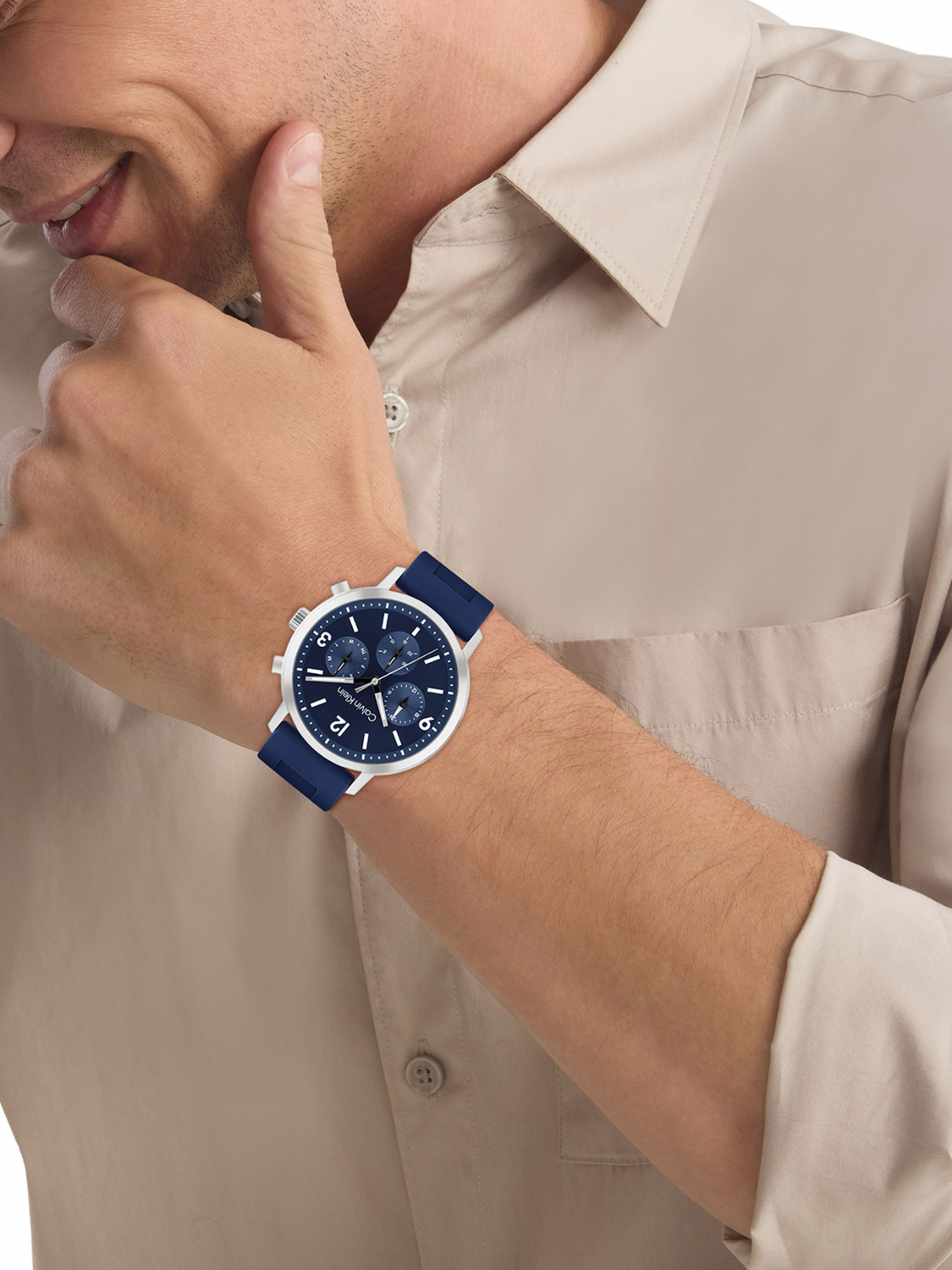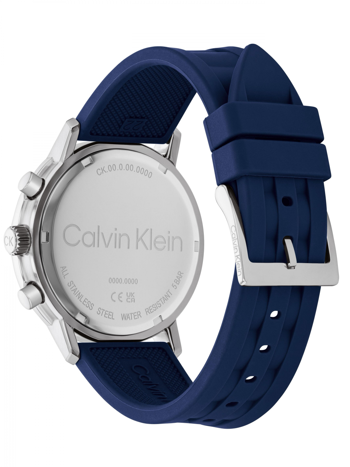 Часы Calvin Klein Gauge 25200460 — это мужская кварцевая  мультифункциональная модель, сочетающая спортивный стиль и фирменный минимализм бренда. Темно-синий круглый циферблат с серебристыми стрелками и метками, защищён минеральным стеклом. На нём отображены даты, дня недели и 24-часового формата времени на трех дополнительных субциферблатах. Корпус изготовлен из нержавеющей стали. Диаметр составляет 44 мм.. Синий силиконовый ремешок с классической застежкой-пряжкой, устойчивый к влаге и удобный для повседневной носки. Водонепроницаемость 5 АТМ, выдерживают случайные брызги и дождь, но не предназначены для плавания.