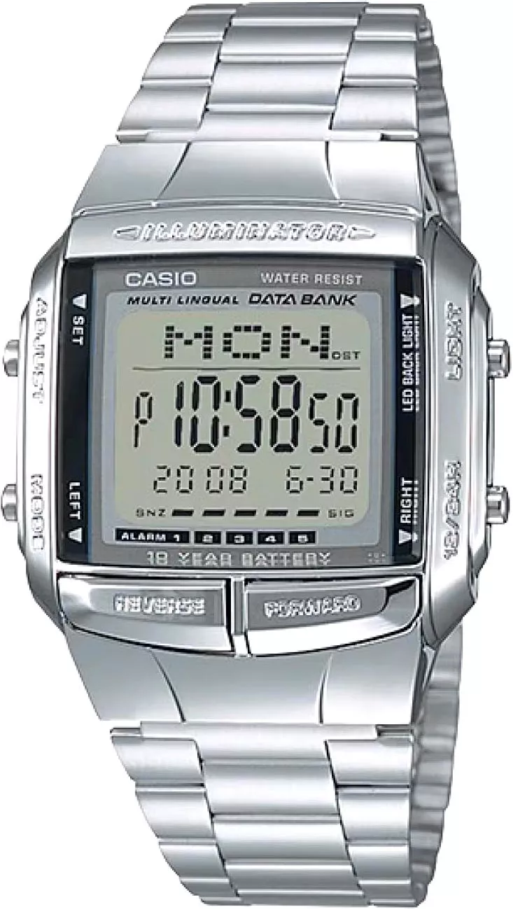 Часы с телефонной книжкой и функцией второго часового пояса станут идеальным выбором путешественника. Vintage. Циферблат подсвечивается светодиодом. Послесвечение. Цвет подсветки: зеленый. Второй часовой пояс. Записная книжка на 30 ячеек памяти для записи имен и телефонных номеров, каждая запись может включать в себя текст из 8 букв и 15 цифр, автосортировка, поддержка 13 языков. 12-ти и 24-х часовой формат времени. Секундомер с точностью показаний 1/100с и временем измерения 24ч. SPLIT-хронограф. Таймер обратного отсчета от 1мин до 24ч. Типы сигналов: ежедневный, ежемесячный, каждый день определенного месяца, на определенную дату. Батарея рассчитана на 10 лет. Задняя крышка крепится на 4-х винтах. Браслет с регулируемой застежкой.
