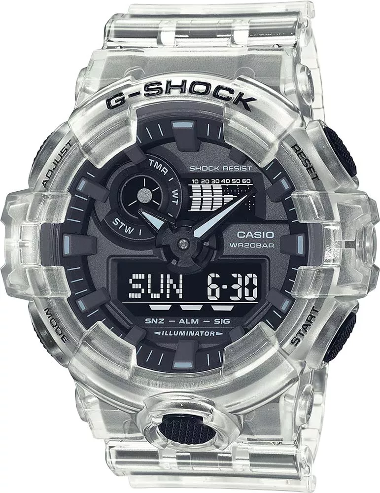Благодаря стильному дизайну и крупным стрелкам, часы имеют не только отличный внешний вид, но и обладают действительно удобной индикацией времени. G-Shock. Новинка с прозрачным корпусом в серии часов GA-700.