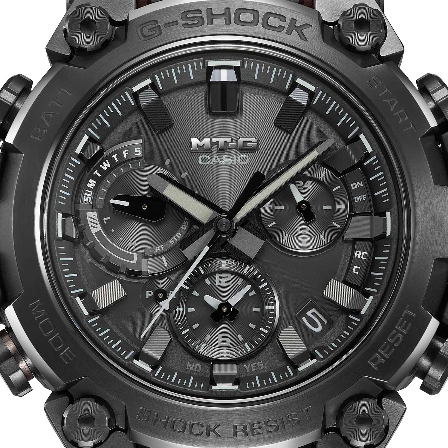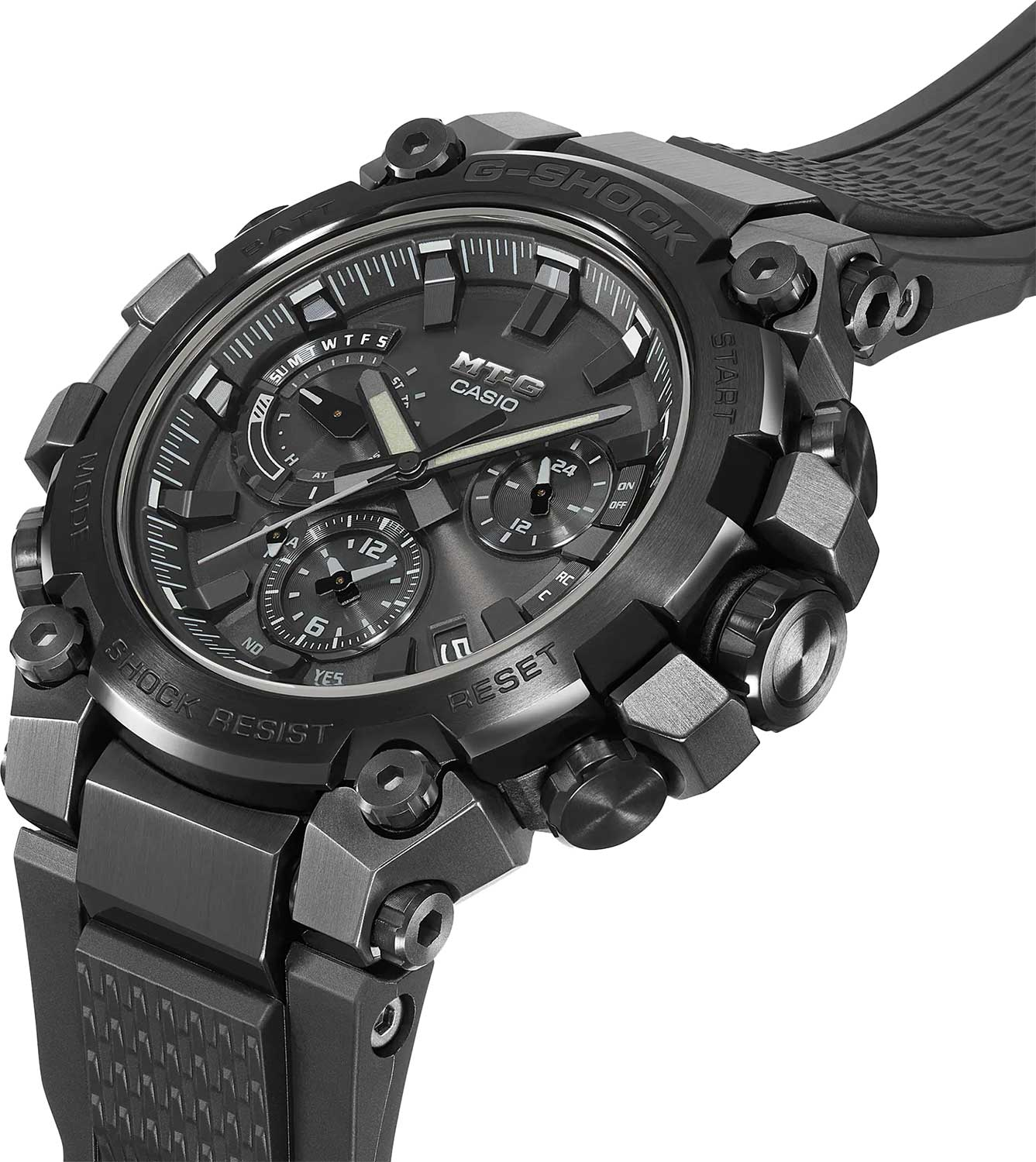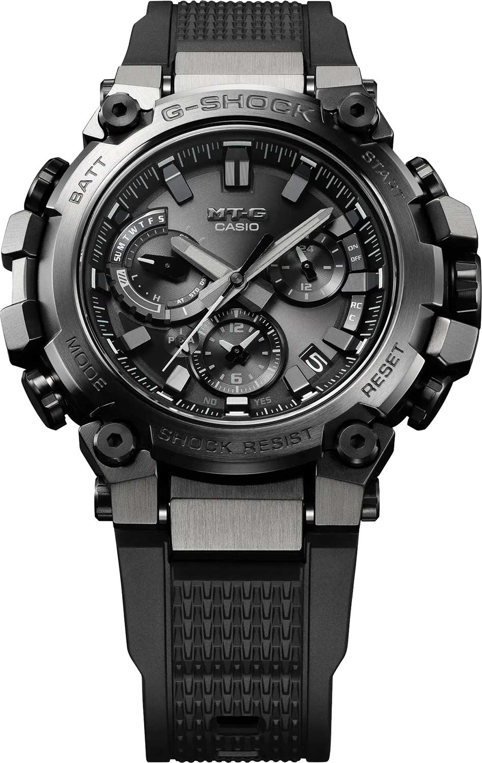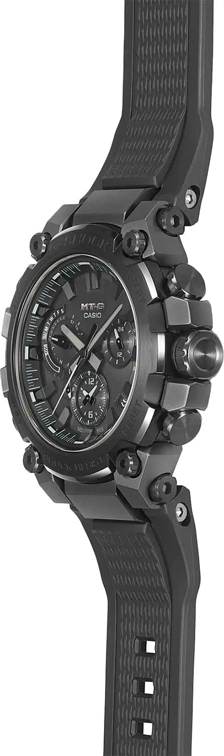 Премиальные противоударные часы с множеством дополнительных функций созданы для любителей приключений. MT-G. Новинка в премиальной серии часов G-SHOCK MTG, которые собираются только в Японии на производстве Casio в Ямагата. Противоударный корпус защищает механизм от ударов и вибрации. Противоударная система Dual Core Guard состоит из двух систем Carbon Core Guard и Metal Core Card. Тройная защита Triple G Resist от воздействия гравитационной, центробежной и вибрационной сил. Питание от солнечной энергии Tough Solar - солнечные батарейки большой мощности, индикатор заряда батареи. Функция автоматического сохранения энергии. Время работы аккумулятора без подзарядки - 5 месяцев, при включенной функции сохранения энергии - 18 месяцев. Циферблат подсвечивается ярким светодиодом. Послесвечение. Цвет подсветки: белый. Необритовое светонакопительное покрытие обеспечивает длительное послесвечение в темноте даже после кратковременного нахождения на свету. Секундомер с точностью показаний 1с и временем измерения 24ч. SPLIT-хронограф. Таймер обратного отсчета от 1мин до 24ч. Окошко даты находится между метками 4 и 5 часов. Ретроградный указатель дня недели. Второй часовой пояс в 24-х часовом формате. Мировое время – 27 часовых поясов. Автоматический переход на зимнее и летнее время. Технология Multi Band 6 позволяет принимать сигналы от шести радиовышек, расположенных в различных точках земного шара, которые передают временные сигналы из определенных атомных часов. Коррекция текущего времени радиосигналом почти по всему миру: Англия, Германия, США, Япония и Китай. Функция автоматической коррекции положения стрелок проверяет положение стрелок каждый час и корректирует его в случае необходимости. Система Smart Access с помощью электронной заводной головки обеспечивает простой и удобный доступ ко всем важным функциям часов. Нажатие или поворот заводной головки позволяет переключаться между различными режимами и активировать будильник, таймер, секундомер, а также настраивать функцию мирового времени. Синхронизация со смартфоном по Bluetooth® через приложение SHOCK-Connected G. При подключении к смартфону часы корректируют текущее время, настройки мирового времени (300 городов), таймера и будильника. Функция поиска телефона. Блокировка заводной головки. Циферблат с метками в виде штрихов выполнен по технологии Sunray (солнечные лучи). Завинчивающаяся заводная головка с защитой. Водонепроницаемость 200м (в соответствии с ISO 2281). Ремешок из полимерного материла с классической застежкой.