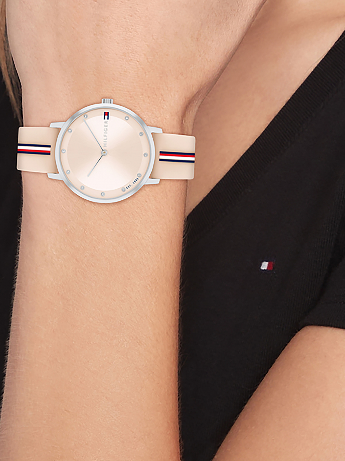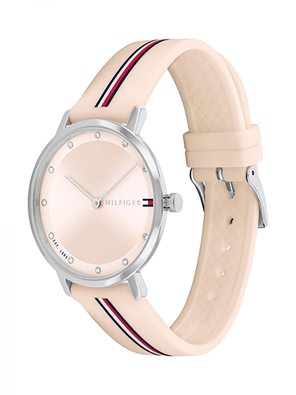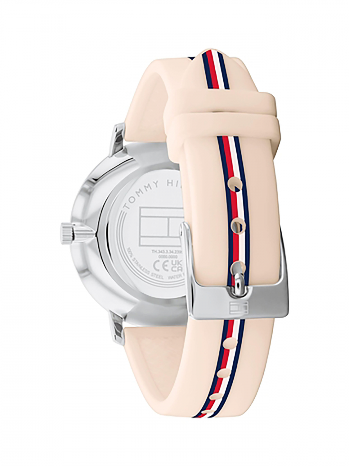 Часы наручные женские кварцевые Tommy Hilfiger. Стальной корпус. Минеральное стекло. Спортивный,силиконовый ремешок,выполнен в цветовом решении этого бренда.Ремешок на традиционной застежке.Водозащита 5ATM.