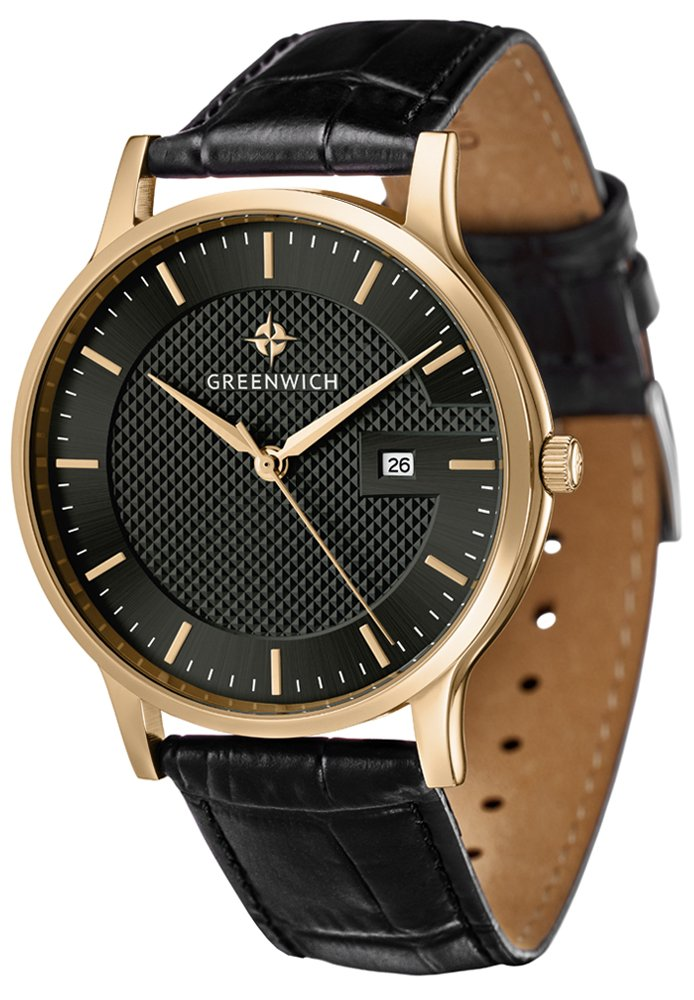 Классические часы с кварцевым механизмом смотрятся элегантно и стильно. Изысканное гильоше по центру черного циферблата придает ему объем и притягивает взгляд. Здесь расположились три стрелки: часовая, минутная и секундная. В часах предусмотрена функция определения даты — в положении «3 часа». Надежный японский механизм обеспечивает бесперебойную работу. Круглый тонкий корпус диаметром 40 мм удобно ложится на запястье. Он выполнен из нержавеющей стали с PVD-покрытием из желтого золота. Часы установлены на плотный ремешок из натуральной кожи черного цвета. Прошивка в тон делает его более стойким к износу и позволяет сохранить внешний вид ремешка даже при ежедневном использовании.