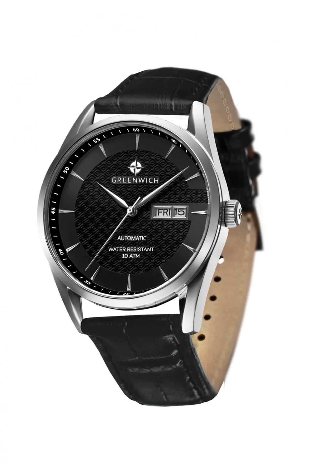 Корпус модели, диаметром 42 мм, состоит из трех частей. Он сделан из нержавеющей стали c двумя видами полировки: зеркальной по безелю и матированием. Задняя крышка прозрачная: вы можете любоваться автоматическим механизмом TMI, на роторе которого выгравирован силуэт парусника, символа английских мореходов. На фоне черного циферблата с рисунком гильоше, напоминающем волны, расположились три центральные стрелки и хорошо читаемое окошко даты и дня недели, выделенное стальной рамкой. Накладные риски закреплены на пластине в форме латинской буквы G, первой буквы в названии бренда.