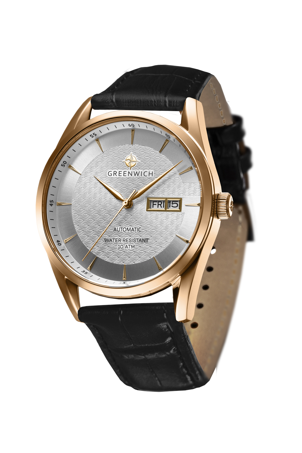 Корпус модели, диаметром 42 мм, состоит из трех частей. Он сделан из нержавеющей стали c PVD-покрытием из розового золота и двумя видами полировки: зеркальной по безелю и матированием. Задняя крышка прозрачная: вы можете любоваться автоматическим механизмом TMI, на роторе которого выгравирован силуэт парусника, символа английских мореходов. На фоне белого циферблата с рисунком гильоше, напоминающем волны, расположились три центральные стрелки и хорошо читаемое окошко даты и дня недели, выделенное стальной рамкой. Накладные риски закреплены на пластине в форме латинской буквы G, первой буквы в названии бренда.