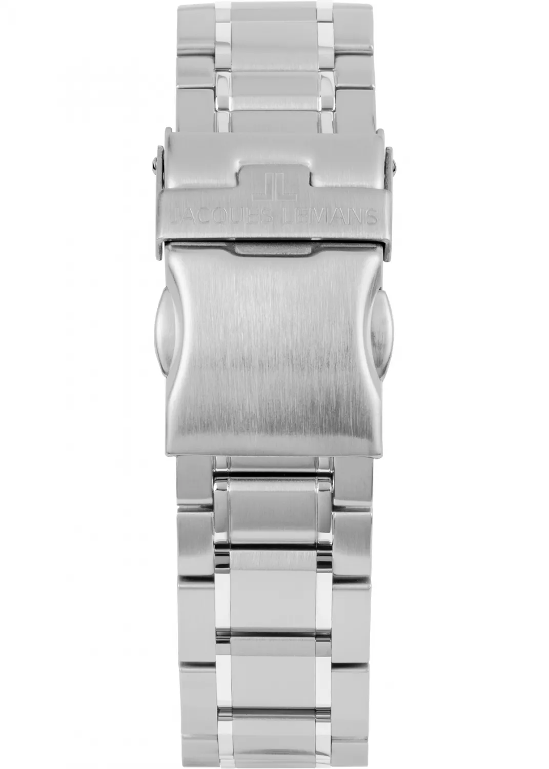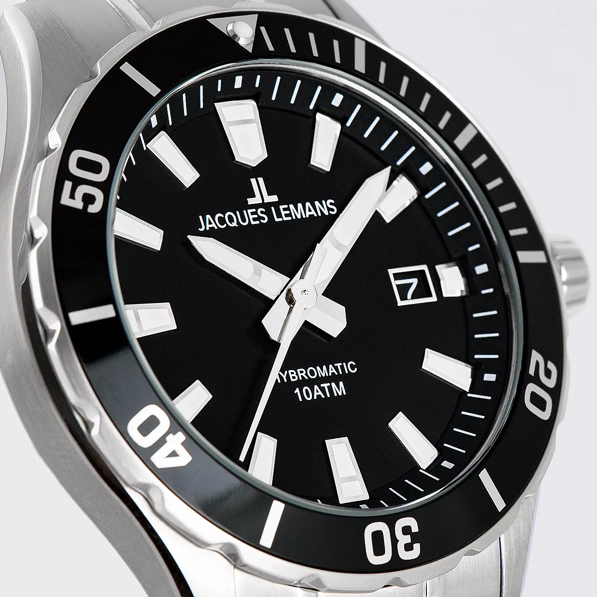 Мужские наручные часы с уникальной технологией Jacques Lemans Hybromatic, которая сочетает в себе функциональность автоматических часов с точностью кварцевых часов. Движение руки приводит в движение маховик, генерирующий электрическую энергию, которая используется для запуска часов. Запас хода 4320 часов (180 дней). Аккумуляторные батареи рассчитаны на 12-15 лет. Круглый стальной корпус с минеральным стеклом. Рифленый безель с минутной шкалой. Широкие заостренные прямоугольные стрелки в стиле Baton. Метки в виде штрихов. Метки и стрелки с люминесцентным покрытием, которое светится в темноте после непродолжительной зарядки на свету. Окошко даты находится в положении 3 часа. Рифленая заводная головка с защитой. Надежный стальной браслет с раскладывающейся застежкой.