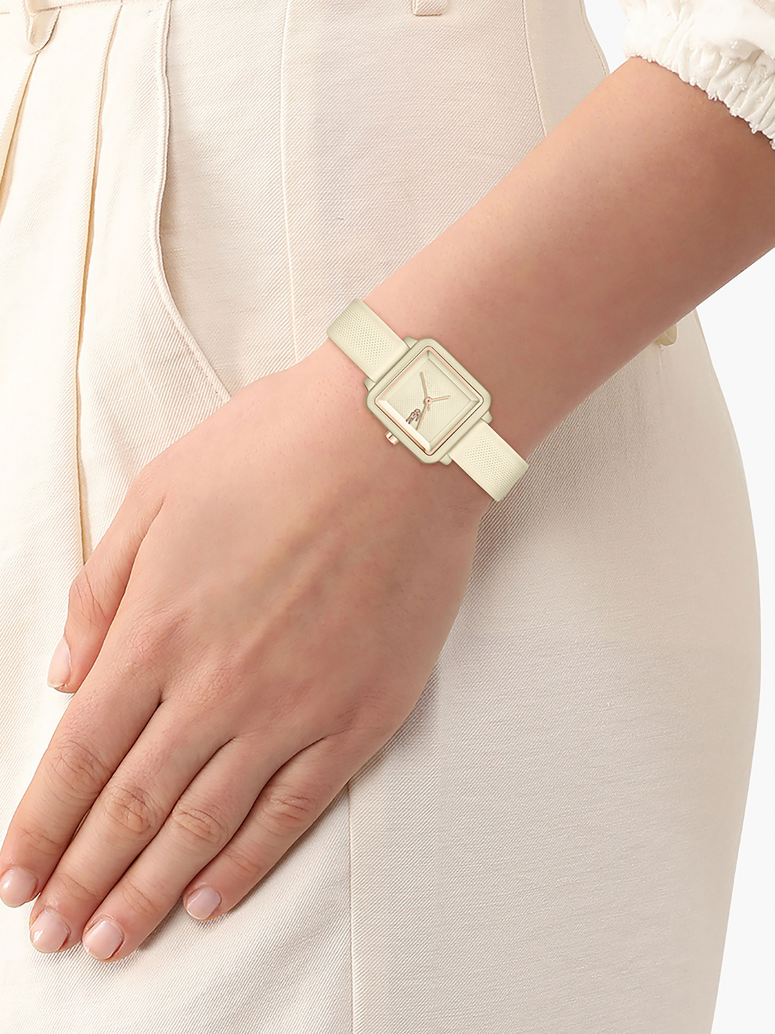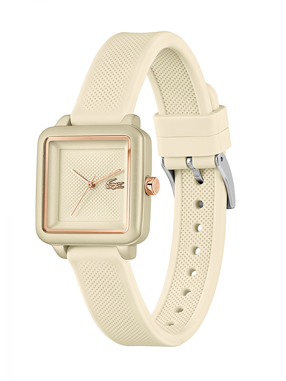 Изящный минималистичный дизайн квадратного циферблата с едва заметным рисунком Хлóпка Пикé – ДНК Lacoste.12.12 Flow. Женские элегантные кварцевые часы,выполненые в нежном нюдовом тоне.Минеральное стекло.Ремешок выполнен из гипоаллергенного и термостойкого силикона. Водостойкость 3 АТМ.