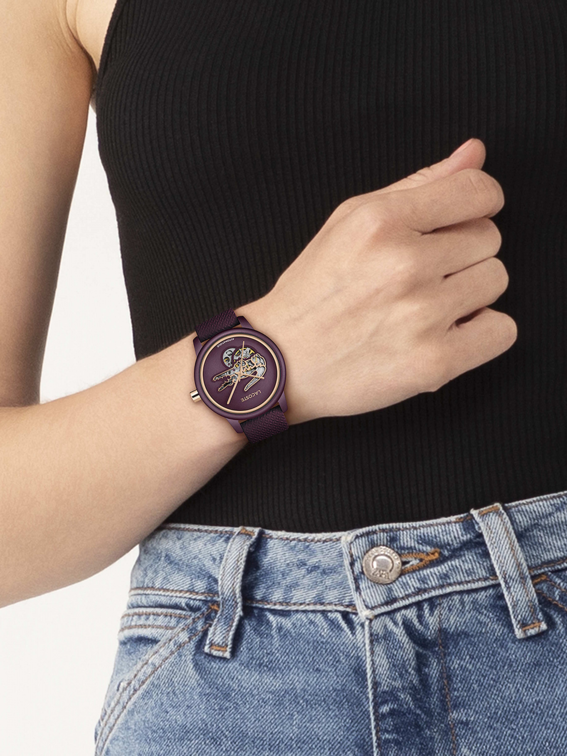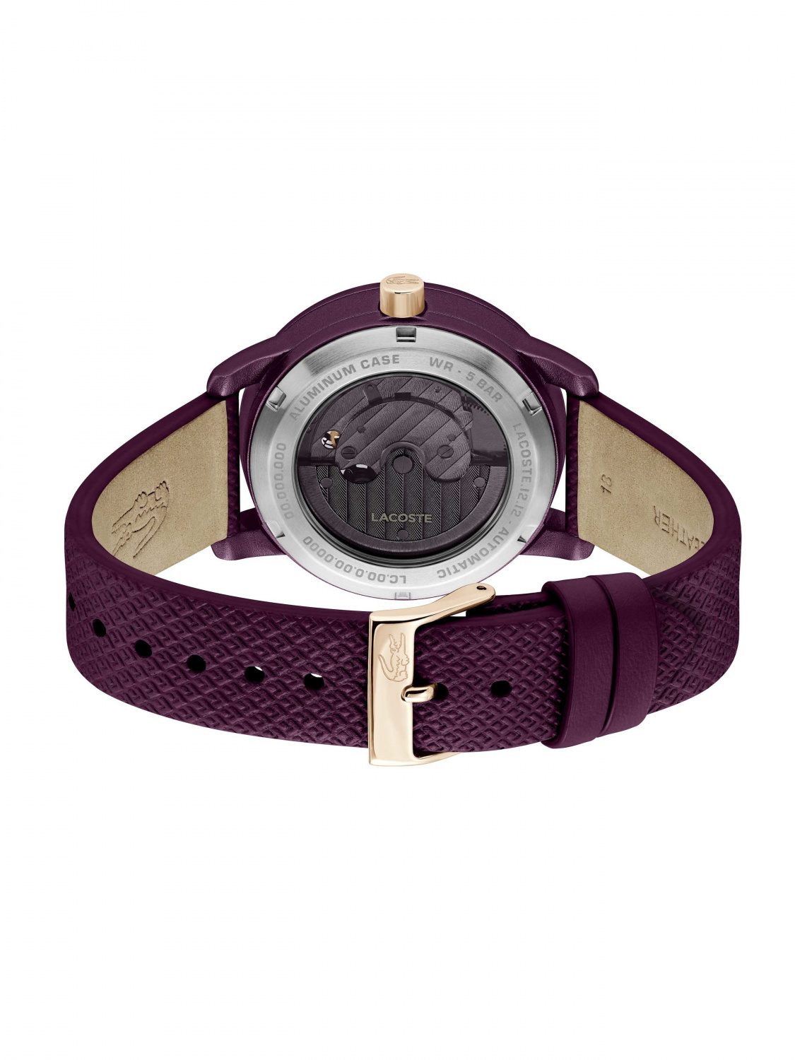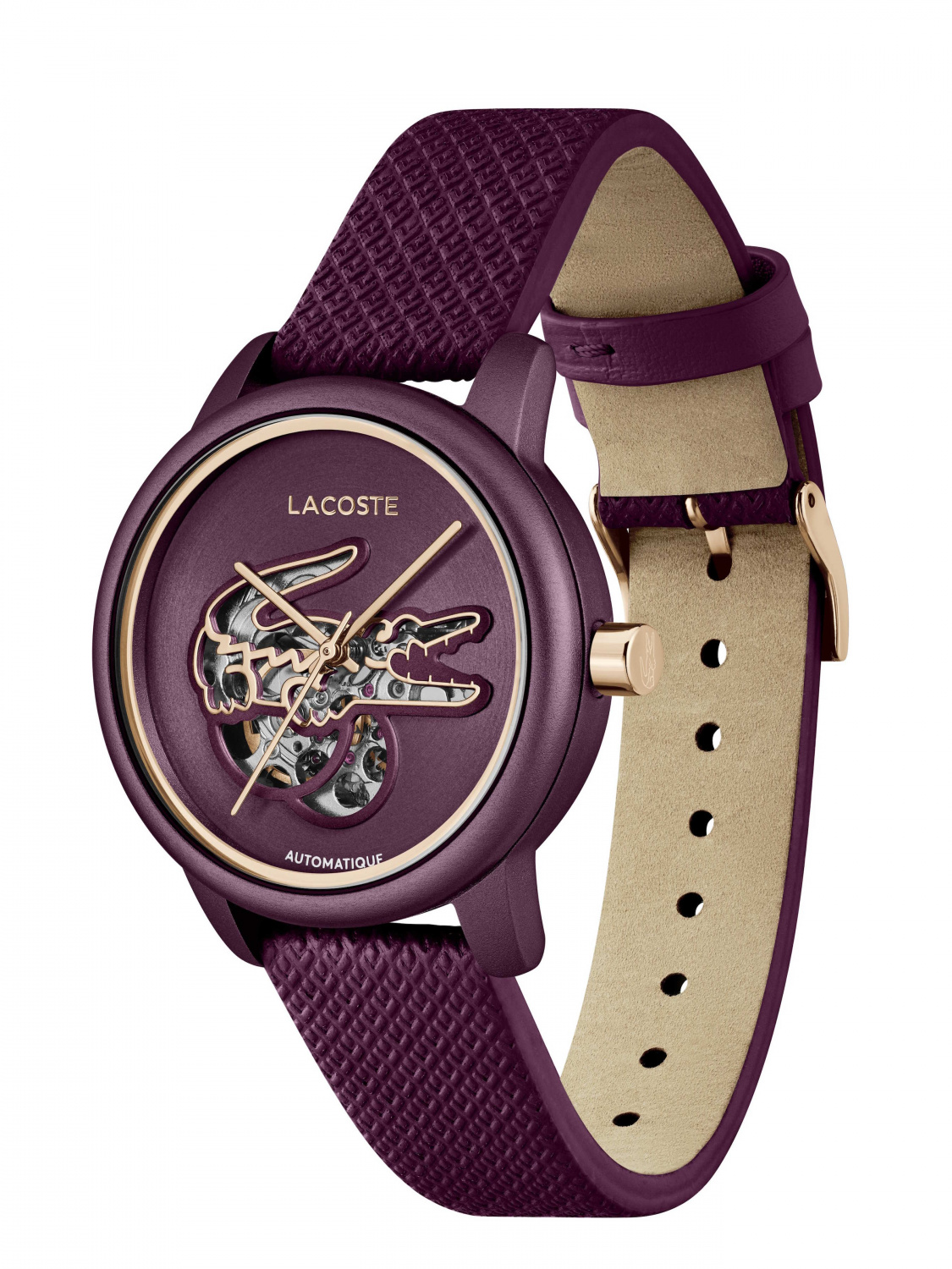 Женские наручные часы Lacoste 2001468 (серия Lacoste.12.12 Automatique) Главной особенностью модели является автоматический механизм, работу которого можно наблюдать через прозрачное окно в форме логотипа-крокодила на циферблате.