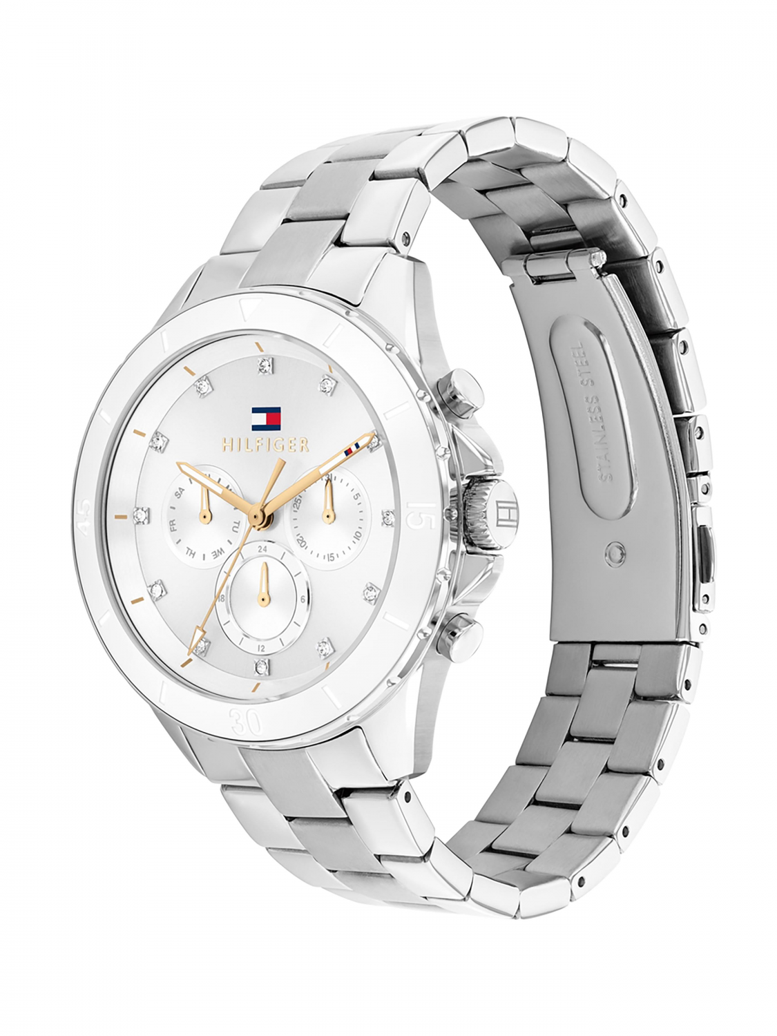 Женские кварцевые часы из коллекции Mellie. Круглый стальной корпус.12 и 24 часовой формат времени. Дата и день недели вынесены на отдельные циферблаты. Циферблат с метками в виде точек- кристаллов.Минеральное стекло. Корпус и браслет из нержавеющей стали. Браслет с раскладной застежкой. Водозащита 5 АТМ.