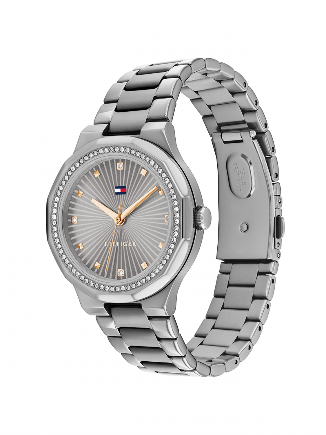Женские кварцевые часы из коллекции Piper.Круглый стальной корпус.Метки в виде точек. Безель и циферблат украшены кристаллами. Минеральное стекло.Корпус и браслет выполнены из стали.Браслет с раскладывающейся застежкой.Водозащита 3 АТМ/bar.